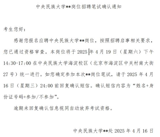 收到短信通知人员请务必确定是否参加笔试,并按短信要求于4月16日(星期三)24:00前回复确认信息。逾期未回复确认信息视同自动放弃考试资格。
