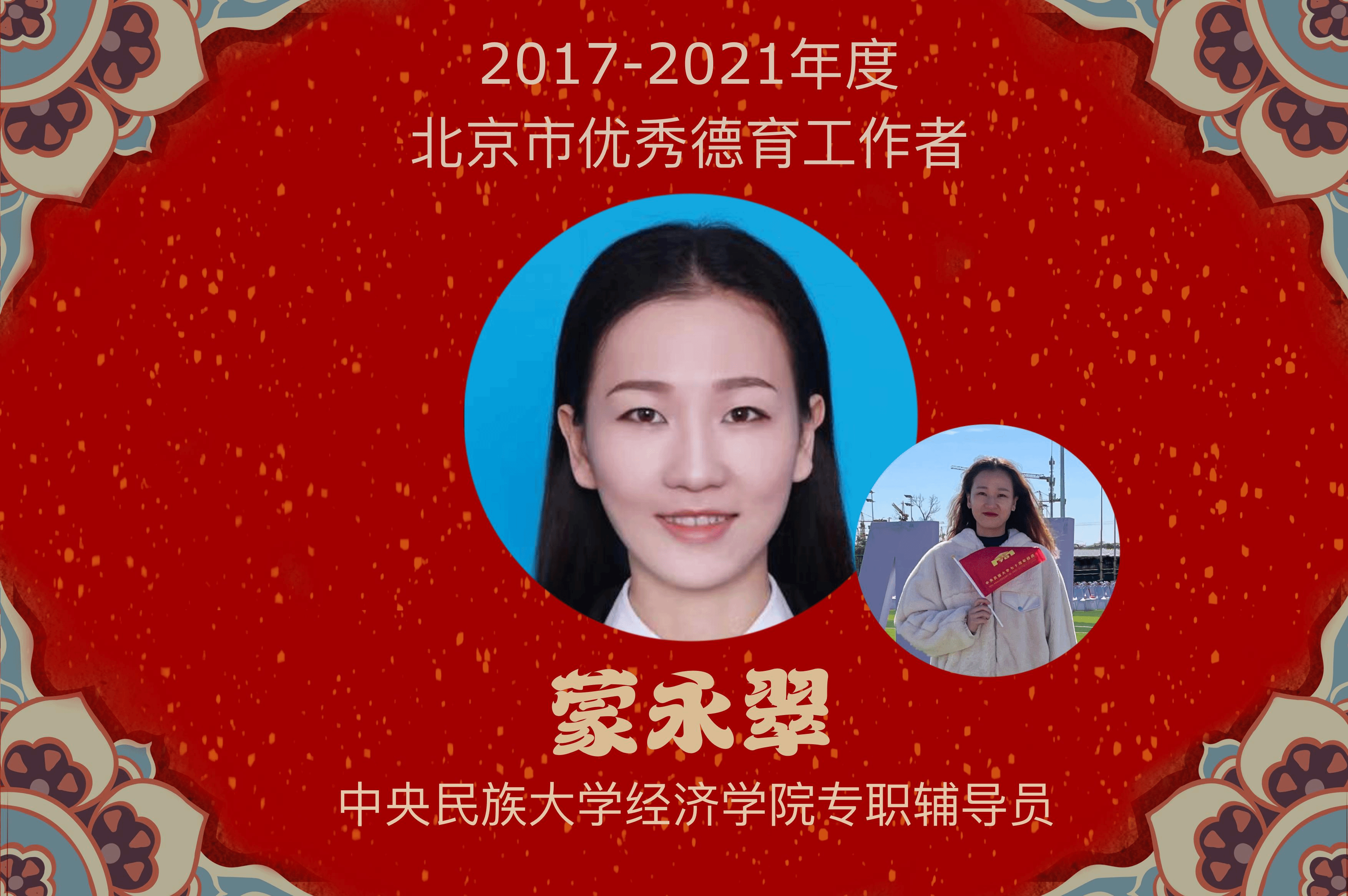 蒙永翠,经济学院团委书记、专职辅导员。自2018年9月参加工作以来,扎实开展大学生思政治教育工作。曾获2019年、2020年校级优秀辅导员、北京市“树立示范典型引领就业工作”先进个人、首都大学生暑期社会实践先进工作者等荣誉称号。坚持以“立德”为根本,以“树人”为核心,把立德树人内化到对不同学段学生的教育、教学、管理等各个领域、各个方面和各个环节,在每一项工作任务中融入思想政治教育内涵,积极担负起学生健康成长路上指导者和引路人的大任。